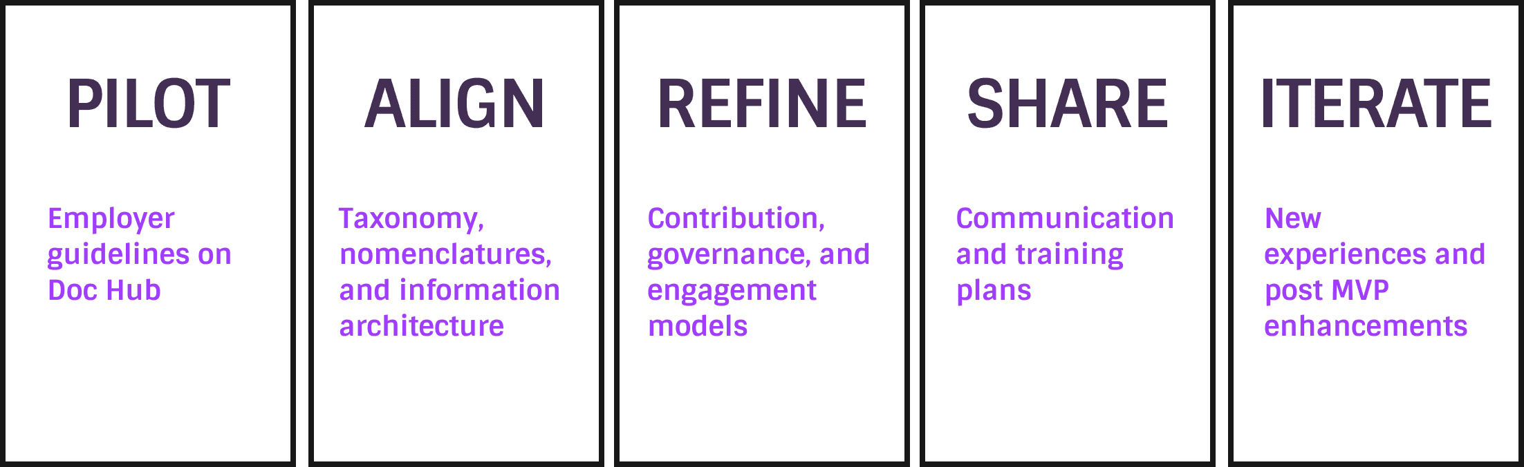 Transforming the site into a working documentation platform required some serious work. I began by outlining the tasks necessary, grouped them into five major epics, and created project briefs for each phase: Pilot, Align, Refine, Share, and Iterate.
